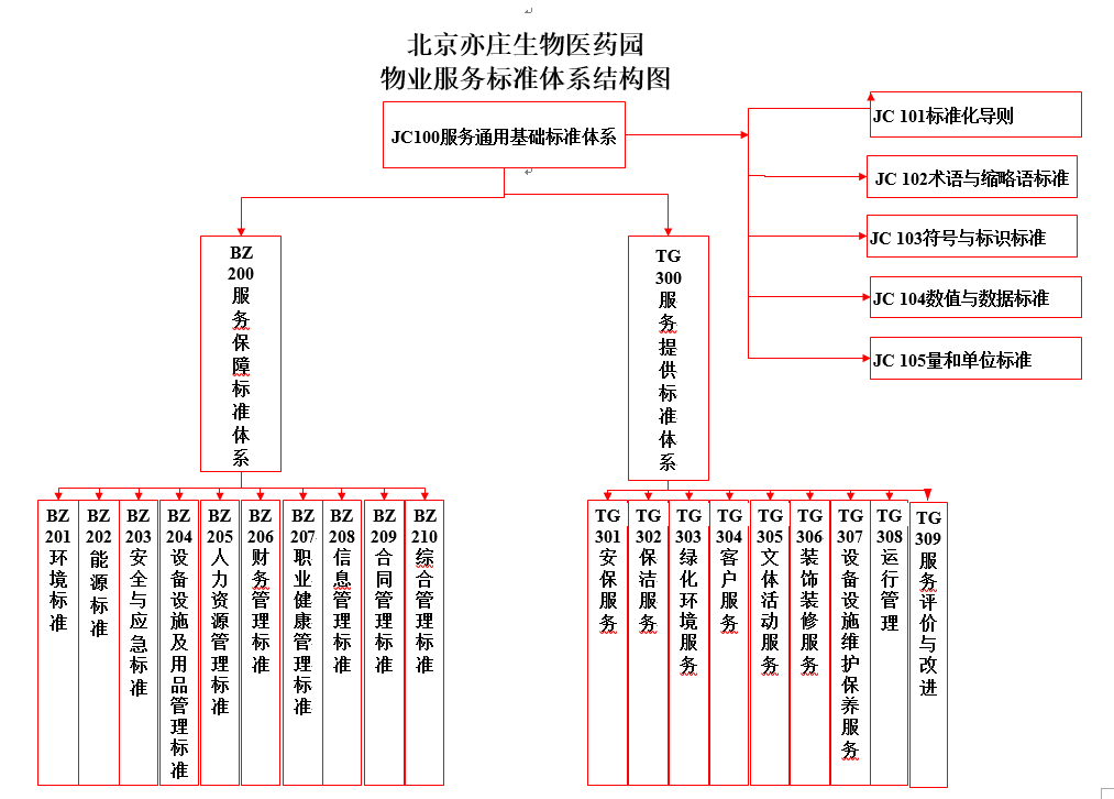 北京亦庄置业有限公司于2013年8月向国标委申请以"亦庄生物医药园"为试点进行“国家级服务业工业物业服务标准化试点项目”,并得到批复同意。 置业公司领导立即成立了标准化领导、编写、实施及保障等小组,并由工业分公司标准化专职机构负责标准化工作。通过3年标准化的建设,紧紧围绕顾客要求和企业的服务目标,深入梳理和分析企业内部管理事项,依据GB/T 2441要求构建了包括服务通用基础、服务保障、服务提供、岗位工作规范四大子体系,共制定企业标准77项,并于2015年 5月28日正式实施。同年12月27日以97分的成绩通过“国家级服务业工业物业服务标准化试点项目”的验收。2016年,为将生物医药园标准化工作进一步提升和宣传,经向国标委申请并于同年11月25日正式通过成为全国首个“工业物业服务业标准化示范项目”,填补了行业领域的空白。 开展标准化工作以来,项目部得到了北京市质量技术监督局北京经济技术开发区分局以及北京经济技术开发区管理委员会的认可与支持。《直播北京》、《中国质量报》、《亦庄时讯》等媒体先后对我标准化工作进行了跟踪报道,同行业及标准化试点企业也纷纷发函参观我公司标准化工作,现如今发展成为标准化培训基地。 我们的使命是通过标准化工作,提升工业物业行业更好的为社会服务,为客户提供“规范、安全、人性化“的服务。